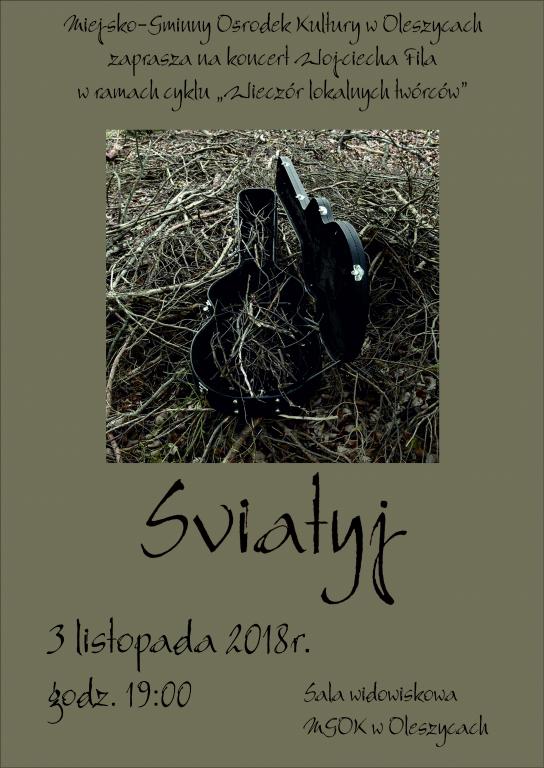 Utalentowany, niesamowity, nieszablonowy, magiczny, wyjątkowy... Tak opisywany jest Sviatyj, czyli Wojciech Fil. Pochodzący z Oleszyc artysta zaprezentował swój repertuar w ramach cyklu „Wieczór Lokalnych Twórców”, którego kolejna edycja odbyła się 3 listopada w Miejsko-Gminnym Ośrodku Kultury w Oleszycach.