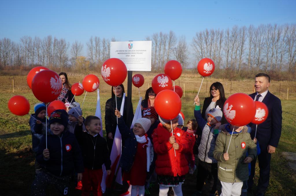 Po wspólnym koncercie panie Dyrektor oraz wybrane klasy VIII a i VI b wraz z opiekunami udały się w okolice stadionu sportowego, by wspólnie posadzić lipę w alei lip z okazji doniosłego święta w ramach akcji – 100 drzew na 100-lecie Odzyskania Niepodległości przez Polskę 1918-2018. Uroczystego poświęcenia drzew dokonał ksiądz dziekan Józef Dudek w asyście księdza Radosława Sokołowskiego. Akcja ma na celu uczczenie w sposób szczególny rocznicy, a przy okazji także zwrócenie uwagi Polaków na potrzebę stałej dbałości o środowisko naturalne Ojczyzny, gdyż taka proekologiczna postawa stanowi dzisiaj jedną z form nowoczesnego patriotyzmu.