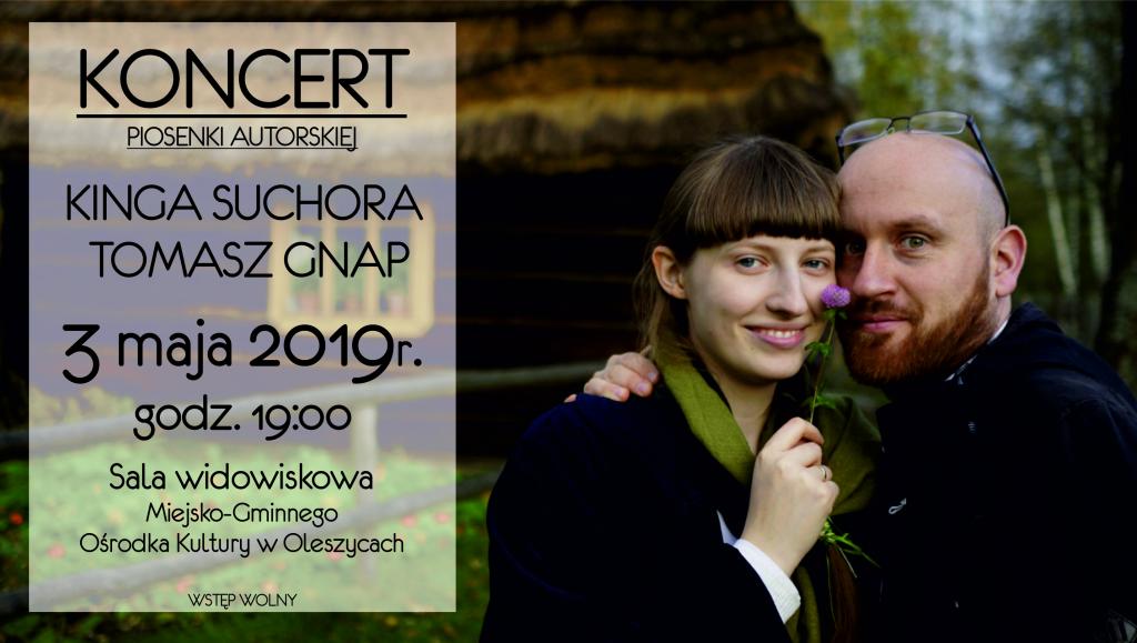 Serdecznie zapraszamy na koncert piosenki autorskiej w wykonaniu Kingi Suchory i Tomasza Gnapa, który odbędzie się 3 maja (piątek) o godz. 19:00 w sali widowiskowej Miejsko-Gminnego Ośrodka Kultury w Oleszycach.