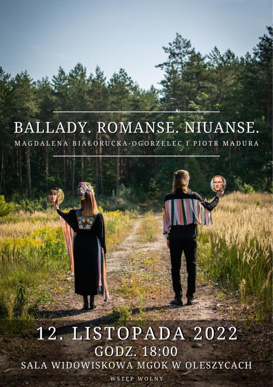 Miejsko-Gminny Ośrodek Kultury w Oleszycach zaprasza na wyjątkowe wydarzenie, które odbędzie się już 12 listopada 2022, o godz. 18:00, w sali widowiskowej naszego ośrodka. „Ballady. Romanse. Niuanse.” to projekt stworzony przez przyjaciół kochających teatr, poezje, muzykę i sztuki plastyczne, balansujący na granicy recitalu i spektaklu muzycznego. Stworzony z szacunkiem do myśli Mickiewicza, zawierający elementy folku, ale i muzyki rozrywkowej. To połączenie klasyki z nowoczesnością. Muzyki z teatrem. Współczesne odczytanie dzieła romantyzmu.