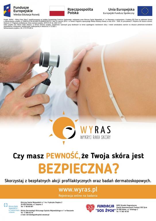 10 czerwca razem z Klinicznym Szpitalem Wojewódzkim nr 1 im. Fryderyka Chopina w Rzeszowie zapraszamy na bezpłatne badania dermatoskopowe, które dedykowane są wszystkim zainteresowanym bez względu na płeć i wiek. Rejestracja obowiązkowa po numerem 17 582 40 60 – liczba miejsc ograniczona.