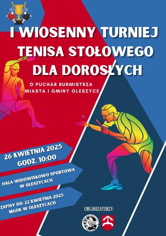 Obrazek Serdecznie zapraszamy na I Wiosenny Turniej Tenisa Stołowego o Puchar Burmistrza Miasta i Gminy Oleszyce. Turniej jest skierowany dla osób dorosłych z terenu Miasta i Gminy Oleszyce.  Start: 26.04.2025 roku o godz. 10:00 w Hali Widowiskowo-Sportowej w Oleszycach. Zgłoszenia przyjmujemy do 22.04.2025 roku. Zapraszamy do zapoznania się z regulaminem turnieju. więcej