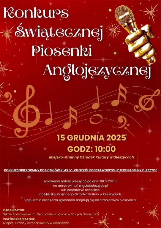 Serdecznie zapraszamy uczniów klas IV–VIII szkół podstawowych z terenu Gminy Oleszyce do udziału w Konkursie Świątecznej Piosenki Anglojęzycznej, który odbędzie się 15 grudnia 2025 r. o godz. 10:00 w Miejsko-Gminnym Ośrodku Kultury w Oleszycach.
