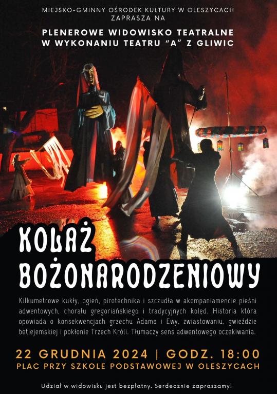 "Kolaż Bożonarodzeniowy" jest to widowisko odwołujące się do tradycji inscenizowania faktów związanych z Bożym Narodzeniem, czerpiące inspirację m.in. z ludowych jasełek. Na widowisko składają się motywy związane z adwentowym oczekiwaniem, biblijne sceny zwiastowania i szukania miejsca w gospodzie, wreszcie wydarzenia związane z samym narodzeniem Chrystusa. Widowisko ma charakter plastyczno-muzyczny, a rzecz opowiadana jest językiem teatru lakowego, teatru tańca, wykorzystuje duże elementy scenograficzne, kukły i ogień, zaś w warstwie muzycznej pieśni adwentowe, chorał gregoriański i tradycyjne kolędy.