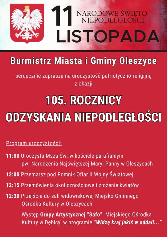 Obrazek Burmistrz Miasta i Gminy Oleszyce zaprasza do wzięcia udziału w obchodach Święta Niepodległości upamiętniającego 105. rocznicę odzyskania Niepodległości przez Polskę, które odbędą się 11 listopada 2023 r.