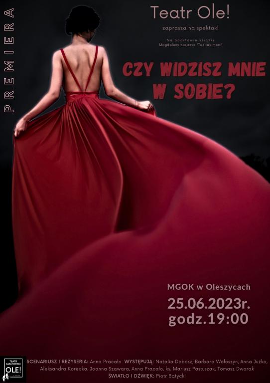 Obrazek Serdecznie zapraszamy na premierę spektaklu "Czy widzisz mnie w sobie?" w wykonaniu Teatru Ole! z Oleszyc, która odbędzie się 25. czerwca 2023r. o godz. 19:00 w sali widowiskowej Miejsko- Gminnego Ośrodka Kultury w Oleszycach.