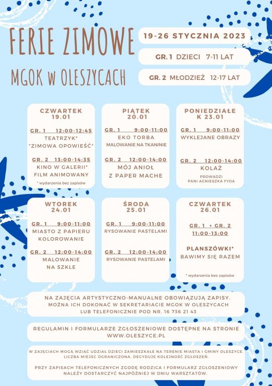 Serdecznie zapraszamy dzieci w wieku od 7 do 17 lat, z terenu miasta i gminy Oleszyce, do uczestnictwa w zajęciach organizowanych przez MGOK w Oleszycach w okresie ferii zimowych. Na wszystkie zajęcia manualno-artystyczne obowiązują zapisy.