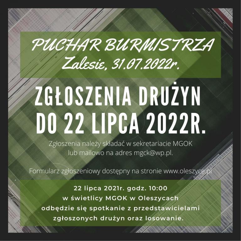 Obrazek Serdecznie zapraszamy do zgłaszania drużyn na Turniej Piłki Nożnej o Puchar Burmistrza Miasta i Gminy Oleszyce. Rozgrywki odbędą się 31 lipca 2022r. na boisku sportowym w Zalesiu. Szczegółowe informacje znajdują się w Regulaminie. Zgłoszenia przyjmowane są do 22.07.2022r. na formularzu zgłoszeniowym dostępnym w załączniku. więcej
