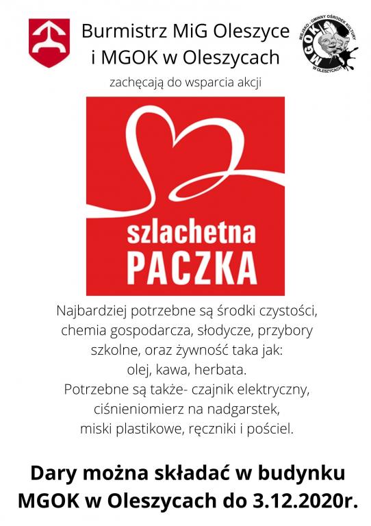 Burmistrz MiG Oleszyce oraz Miejsko-Gminny Ośrodek Kultury w Oleszycach zachęcają do wsparcia akcji Szlachetna Paczka, poprzez składanie darów dla rodzin potrzebujących wsparcia z terenu naszej gminy. Najbardziej potrzebne są środki czystości, chemia gospodarcza, słodycze, przybory szkolne, oraz żywność taka jak:olej, kawa, herbata. Potrzebne są także- czajnik elektryczny, ciśnieniomierz na nadgarstek,miski plastikowe, ręczniki i pościel.