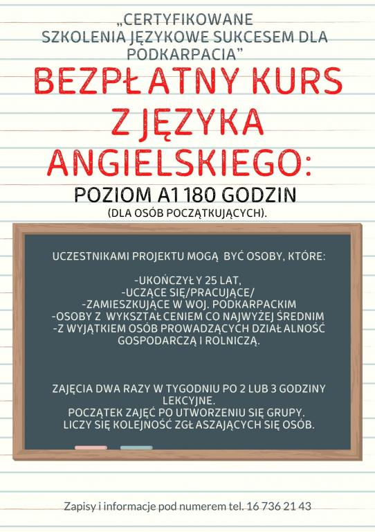 Szukamy 12 chętnych osób z terenu Miasta i Gminy Oleszyce do utworzenia grupy na bezpłatny kurs języka angielskiego, który odbędzie się w Miejsko - Gminnym Ośrodku Kultury w Oleszycach.
