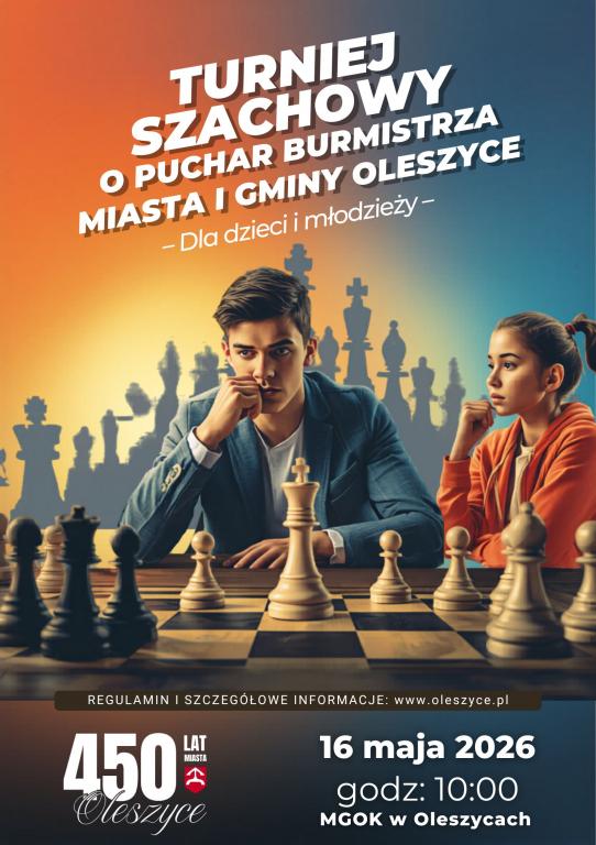 Obrazek Serdecznie zapraszamy dzieci i młodzież do udziału w Turnieju Szachowym o Puchar Burmistrza Miasta i Gminy Oleszyce. To wyjątkowa okazja, by sprawdzić swoje umiejętności, zmierzyć się z innymi pasjonatami królewskiej gry oraz przeżyć sportowe emocje w przyjaznej atmosferze. więcej