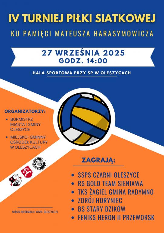 Obrazek Serdecznie zapraszamy wszystkich miłośników sportu i lokalnej integracji na IV Turniej Piłki Siatkowej ku pamięci Mateusza Harasymowicza, który odbędzie się w sobotę, 27 września 2025 roku o godz. 14:00 w hali sportowej przy Szkole Podstawowej im. Jana Pawła II w Oleszycach.