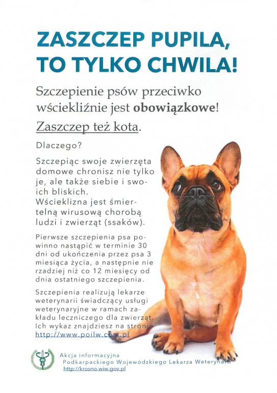 Obrazek Szczepienie psów przeciw wściekliźnie jest obowiązkowe. Więcej informacji na plakacie.