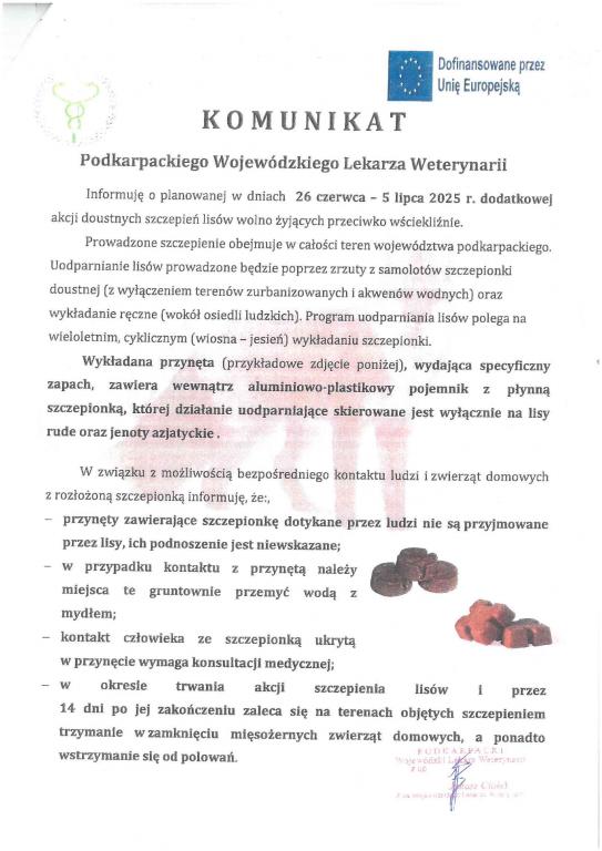 Obrazek Informuję o planowanej w dniach 26 czerwca - 5 lipca 2025 r. dodatkowej akcji doustnych szczepień lisów wolno żyjących przeciwko wściekliźnie.