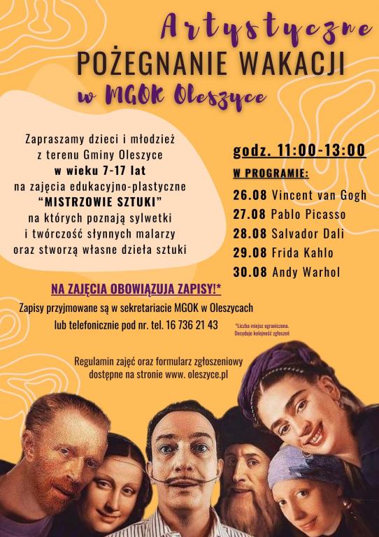Mogą wziąć w nich udział dzieci i młodzież z terenu Gminy Oleszyce, w wieku 7-17 lat. Podczas spotkań uczestnicy poznają sylwetki i twórczość słynnych malarzy oraz stworzą własne dzieła sztuki.