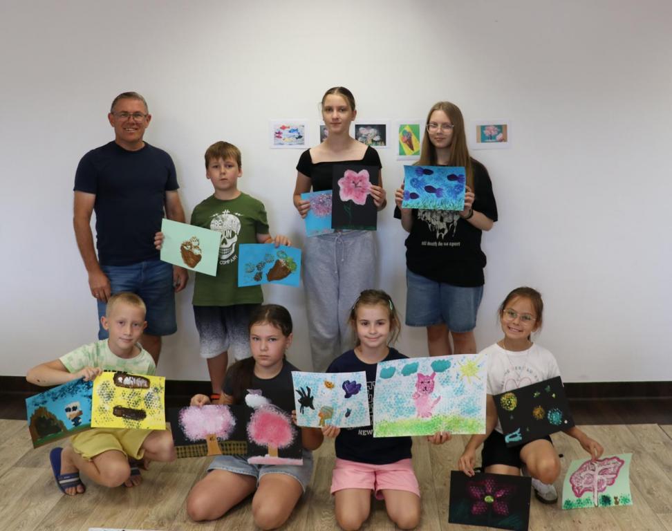 W pierwszym dniu uczestnicy odkryli, że folia bąbelkowa to nie tylko przyjemność z jej „pstrykania”, ale też świetne narzędzie artystyczne. Malując ją farbami i odbijając na kartkach papieru mali artyści stworzyli barwne obrazy przedstawiające: drzewa, kwiaty, kotki, ocean