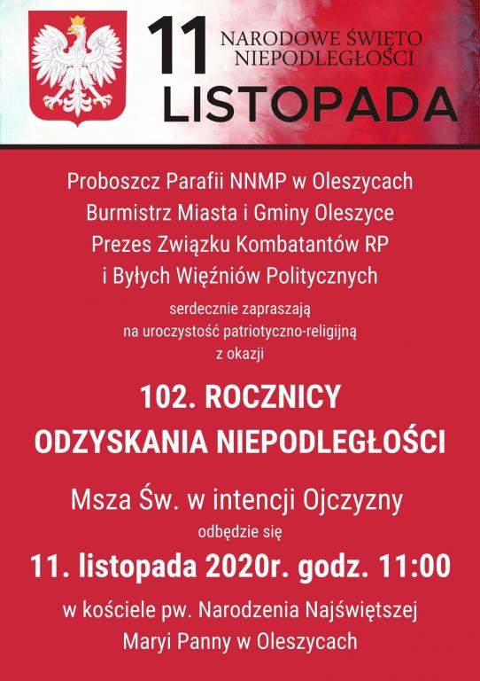Msza Św. w intencji Ojczyzny odbędzie się 11. listopada 2020r. o godz. 11:00, w kościele pw. Narodzenia Najświętszej Maryi Panny w Oleszycach.