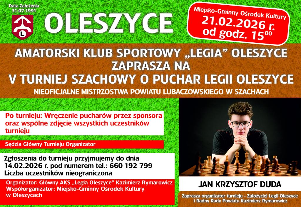 Amatorski Klub Sportowy „Legia” Oleszyce serdecznie zaprasza wszystkich miłośników królewskiej gry do udziału w V Turnieju Szachowym o Puchar Legii Oleszyce. Turniej ...