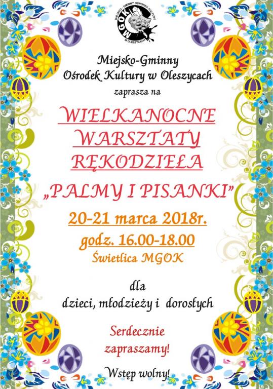 W dniach 20-21 marca odbędą się Wielkanocne Warsztaty Rękodzieła "Palmy i pisanki" dla dorosłych, dzieci i młodzieży. Warsztaty odbywać się będą w świetlicy Miejsko- Gminnego Ośrodka Kultury w Oleszycach, w ...